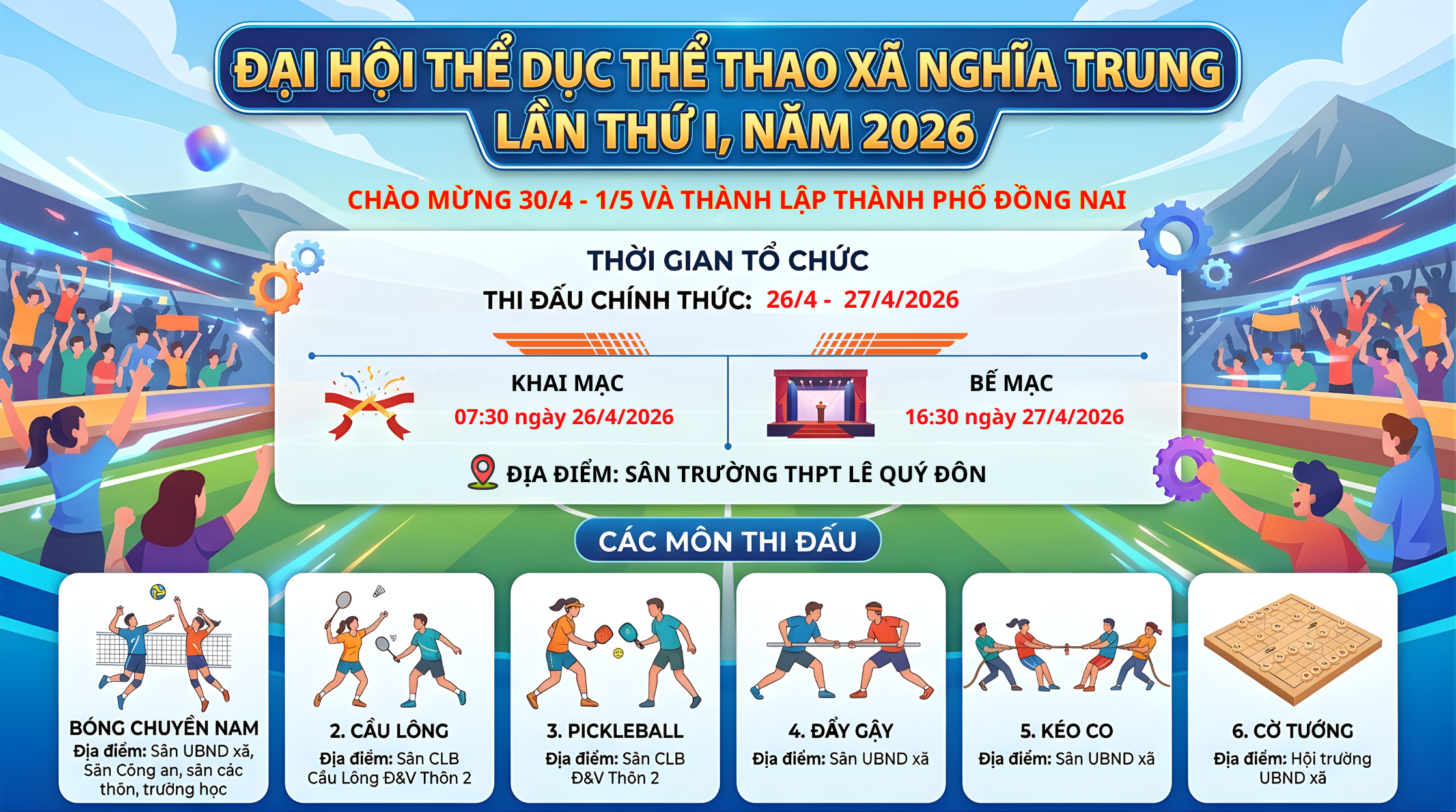 Trong không khí sôi nổi chào mừng các ngày lễ lớn của đất nước, xã Nghĩa Trung đã long trọng tổ chức thành công Đại hội Thể dục Thể thao lần thứ I, năm 2026. Đây là sự kiện có ý nghĩa quan trọng nhằm...