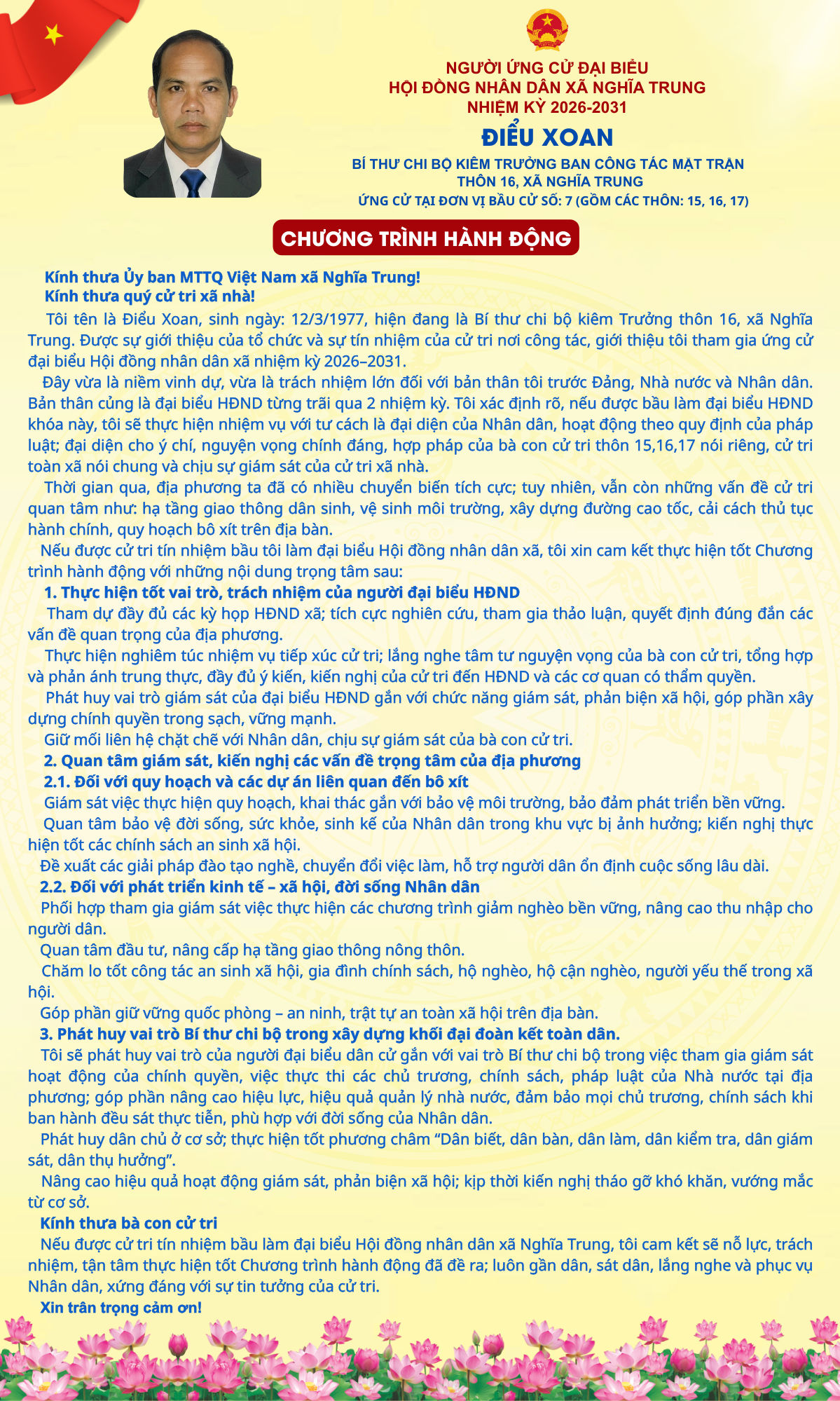 TÓM TẮT TIỂU SỬ NGƯỜI ỨNG CỬ ĐẠI BIỂU HĐND XÃ NGHĨA TRUNG NHIỆM KỲ 2026 - 2031 ĐIỂU XOAN