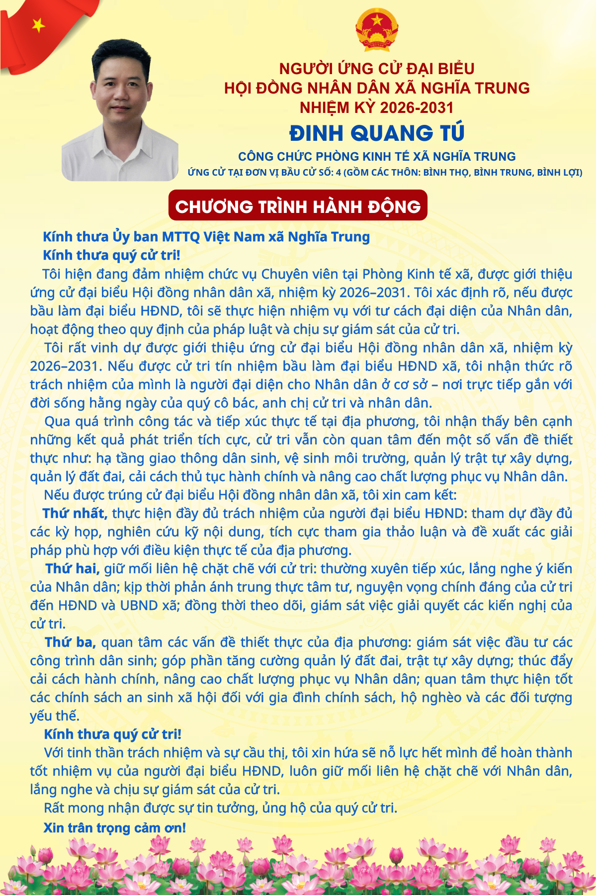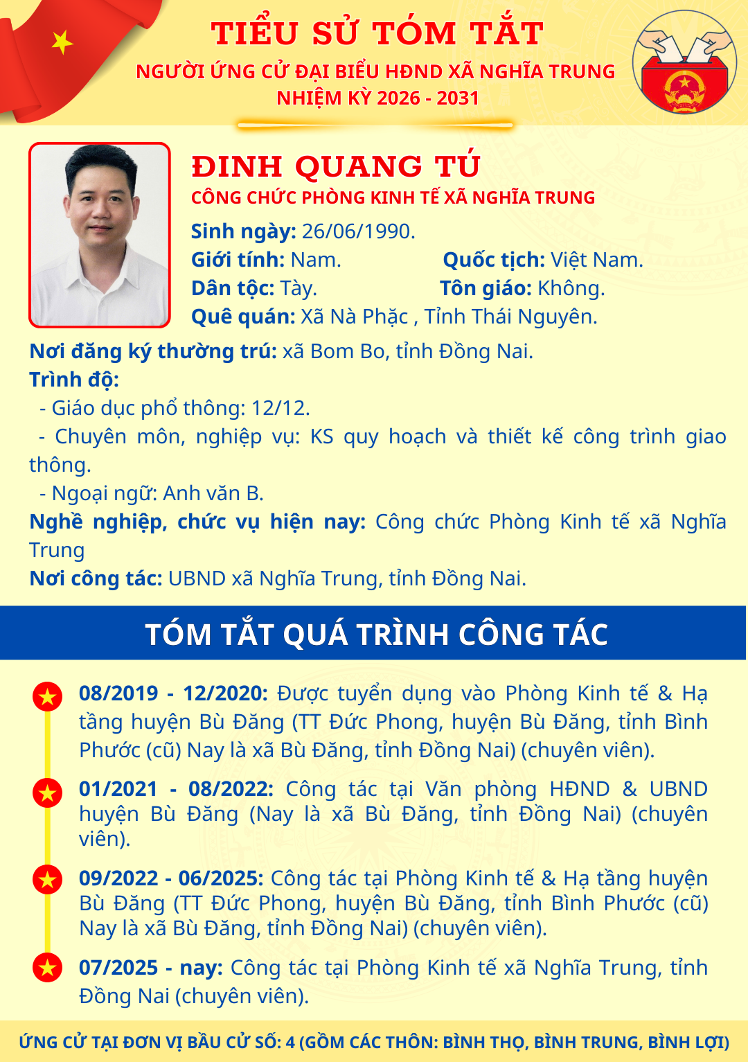 TÓM TẮT TIỂU SỬ NGƯỜI ỨNG CỬ ĐẠI BIỂU HĐND XÃ NGHĨA TRUNG NHIỆM KỲ 2026 - 2031 ĐINH QUANG TÚ