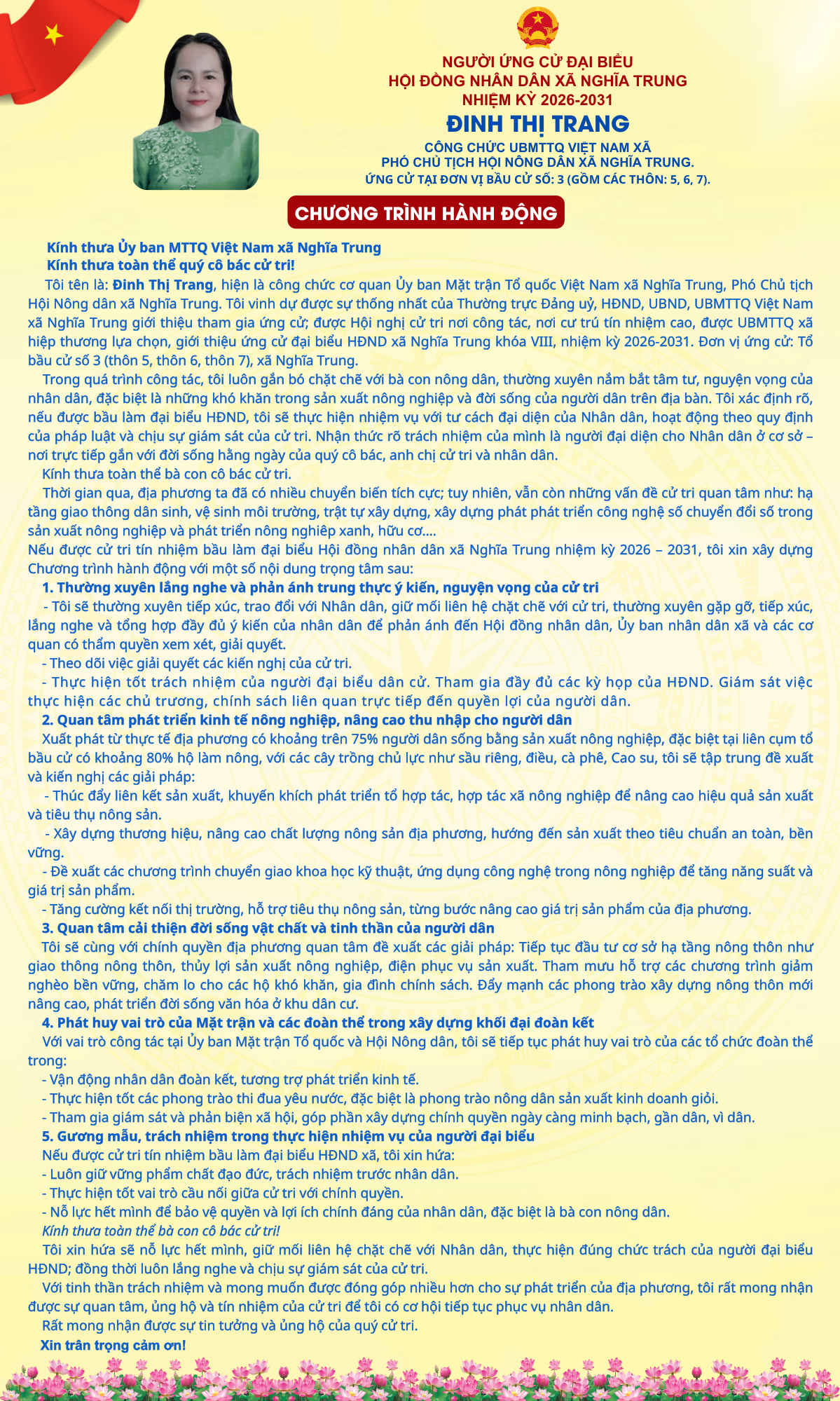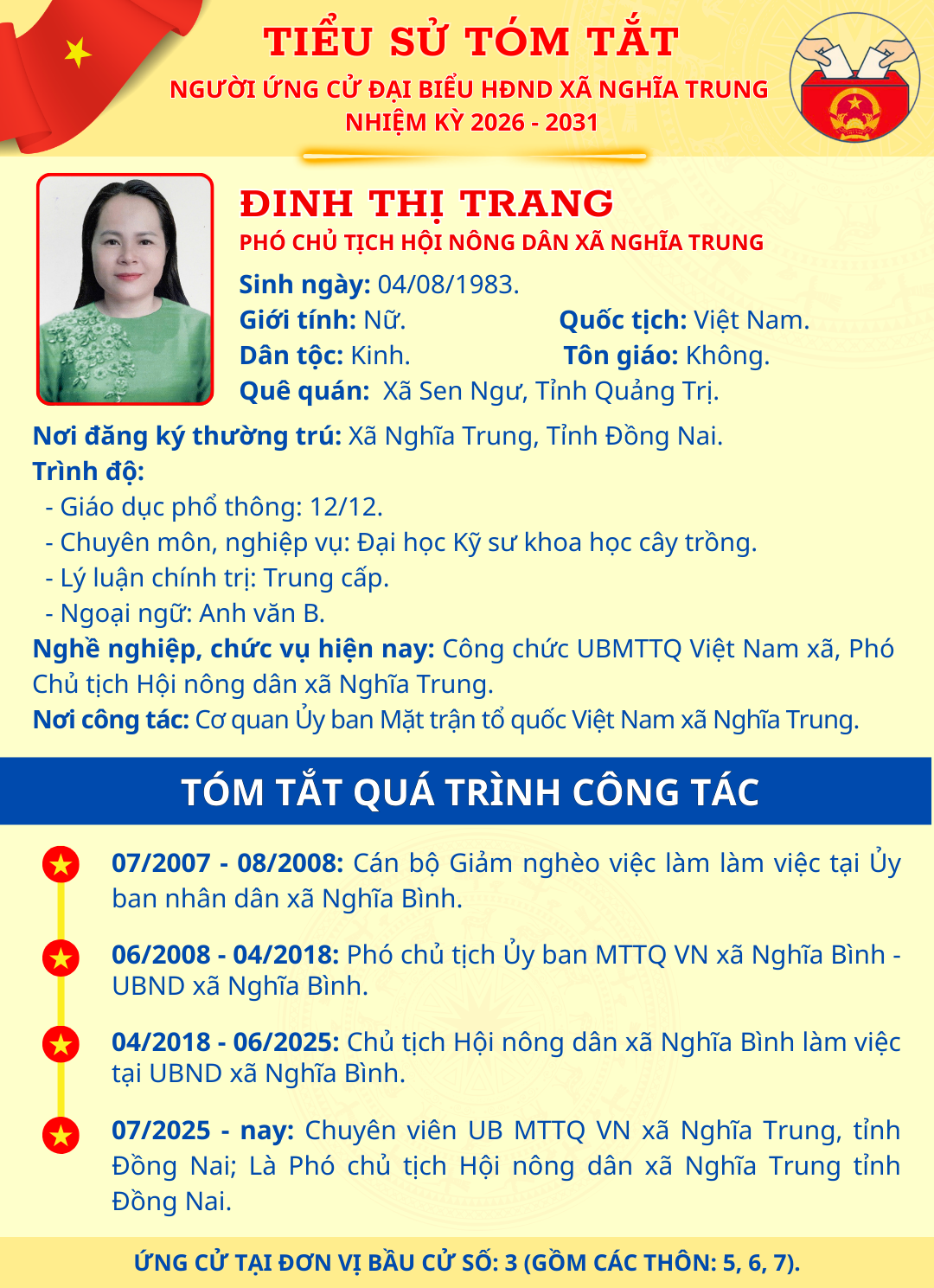 TÓM TẮT TIỂU SỬ NGƯỜI ỨNG CỬ ĐẠI BIỂU HĐND XÃ NGHĨA TRUNG NHIỆM KỲ 2026 - 2031 ĐINH THỊ TRANG