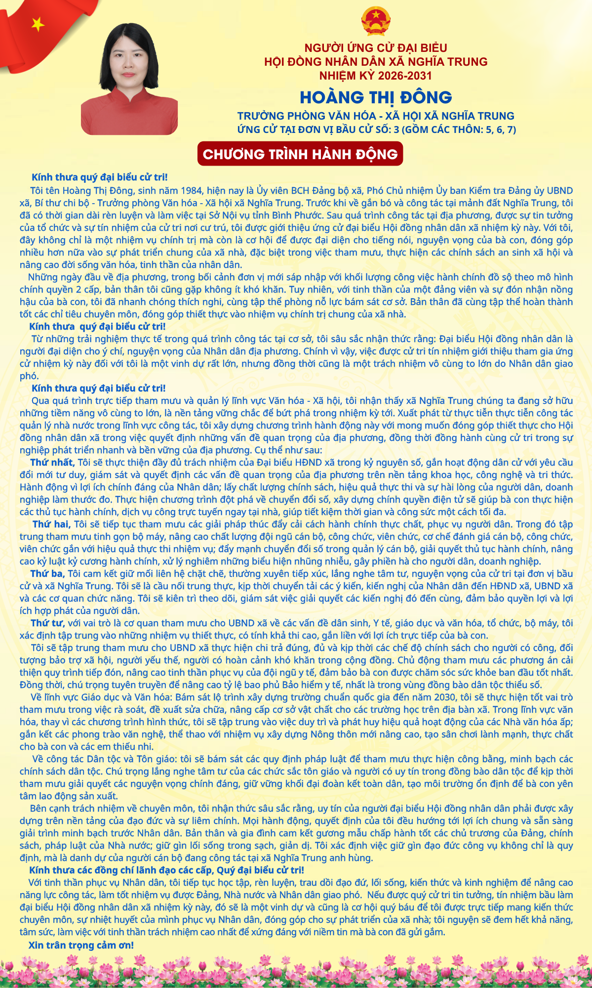 TÓM TẮT TIỂU SỬ NGƯỜI ỨNG CỬ ĐẠI BIỂU HĐND XÃ NGHĨA TRUNG NHIỆM KỲ 2026 - 2031 HOÀNG THỊ ĐÔNG