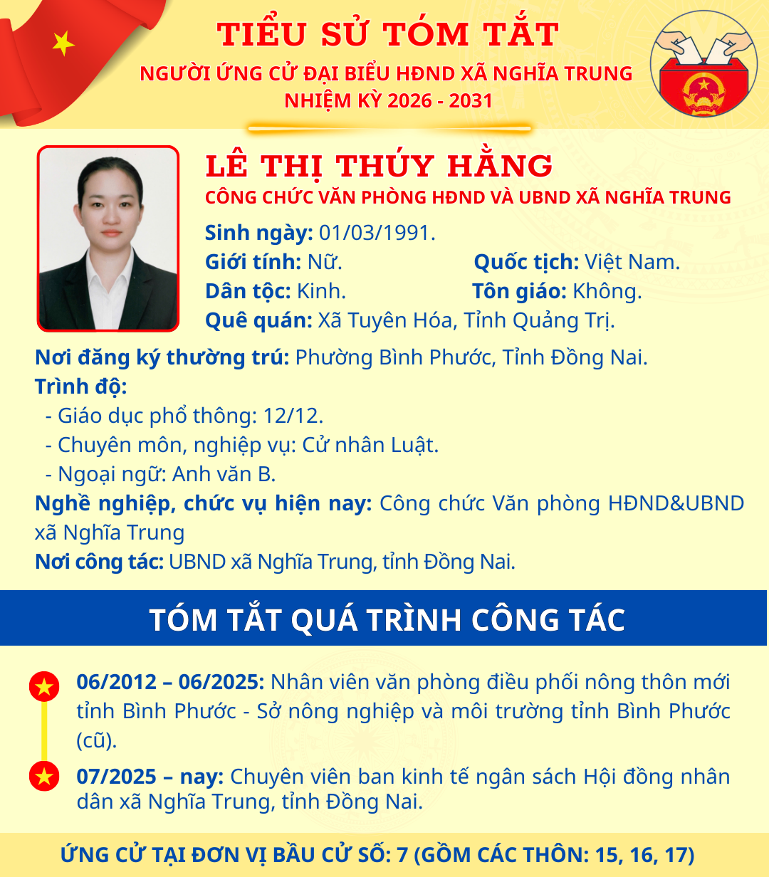 TÓM TẮT TIỂU SỬ NGƯỜI ỨNG CỬ ĐẠI BIỂU HĐND XÃ NGHĨA TRUNG NHIỆM KỲ 2026 - 2031 LÊ THỊ THÚY HẰNG