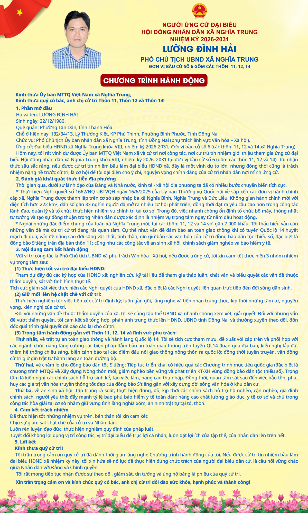 TÓM TẮT TIỂU SỬ NGƯỜI ỨNG CỬ ĐẠI BIỂU HĐND XÃ NGHĨA TRUNG NHIỆM KỲ 2026 - 2031 LƯỜNG ĐÌNH HẢI