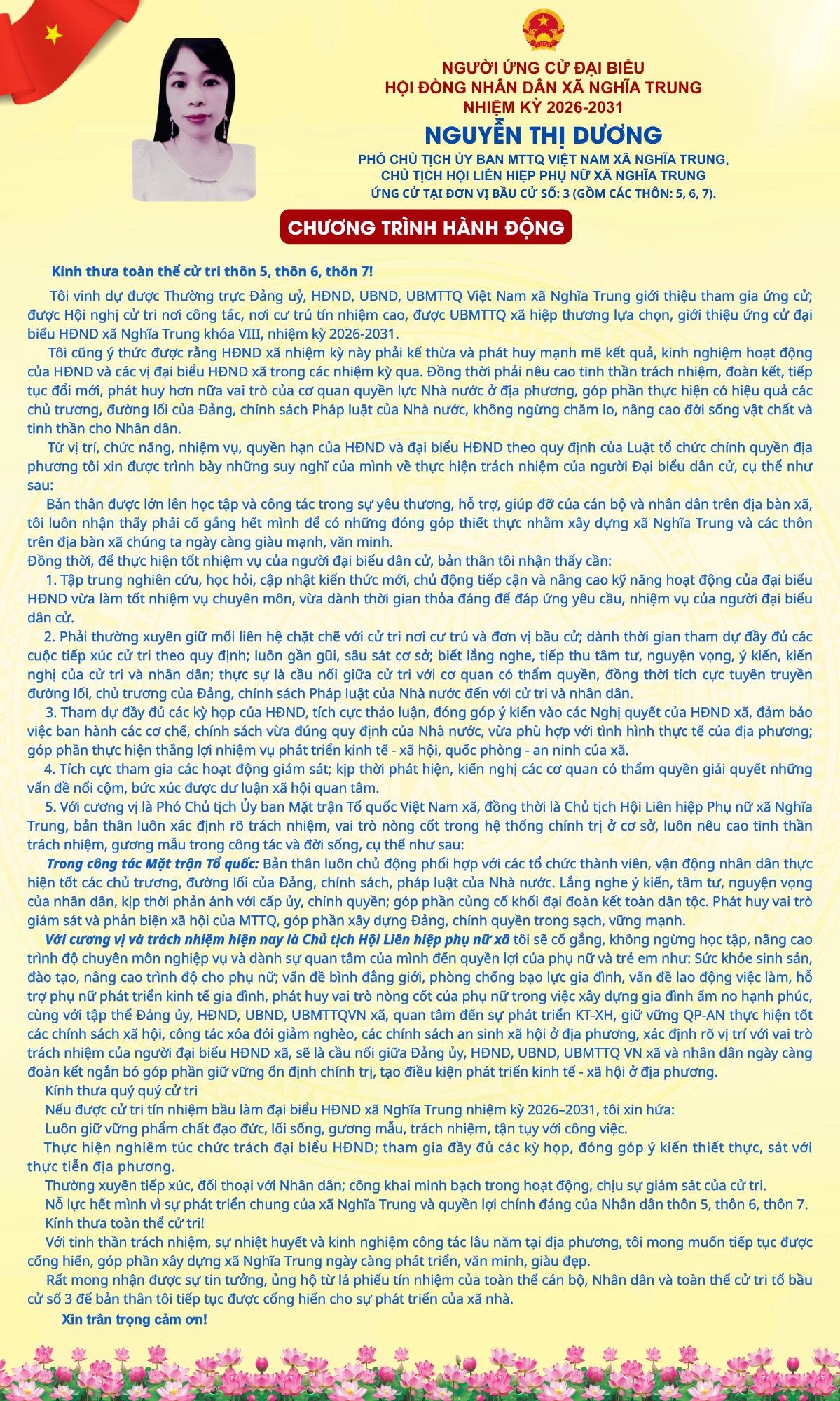 TÓM TẮT TIỂU SỬ NGƯỜI ỨNG CỬ ĐẠI BIỂU HĐND XÃ NGHĨA TRUNG NHIỆM KỲ 2026 - 2031 NGUYỄN THỊ DƯƠNG