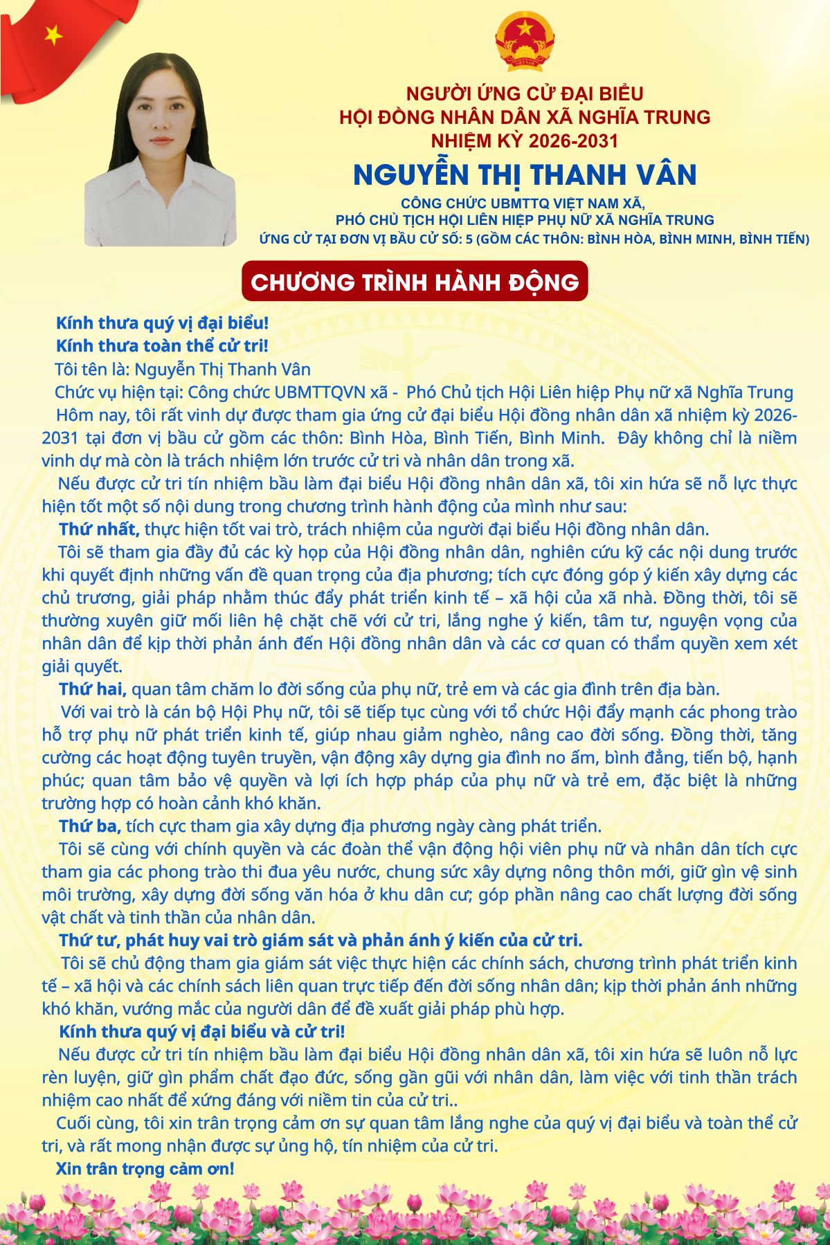 TÓM TẮT TIỂU SỬ NGƯỜI ỨNG CỬ ĐẠI BIỂU HĐND XÃ NGHĨA TRUNG NHIỆM KỲ 2026 - 2031 NGUYỄN THỊ THANH VÂN