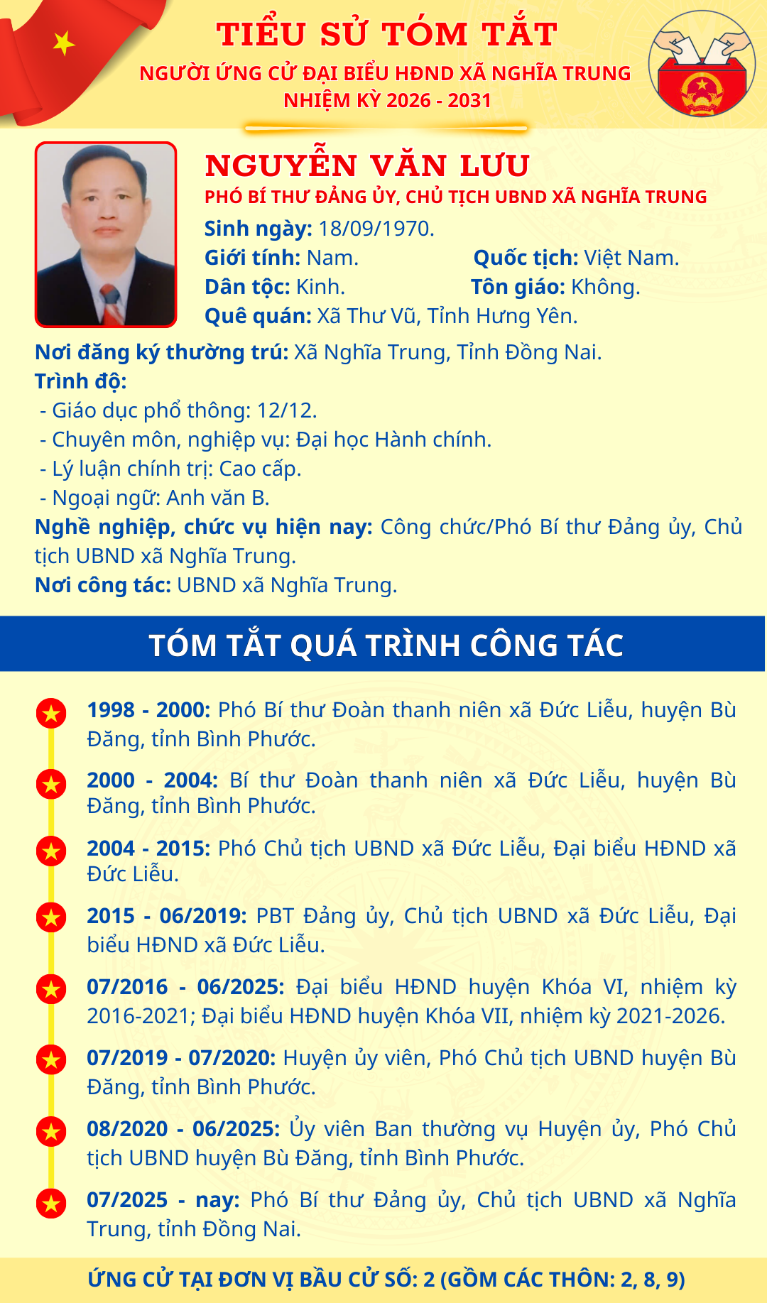 TÓM TẮT TIỂU SỬ NGƯỜI ỨNG CỬ ĐẠI BIỂU HĐND XÃ NGHĨA TRUNG NHIỆM KỲ 2026 - 2031 NGUYỄN VĂN LƯU