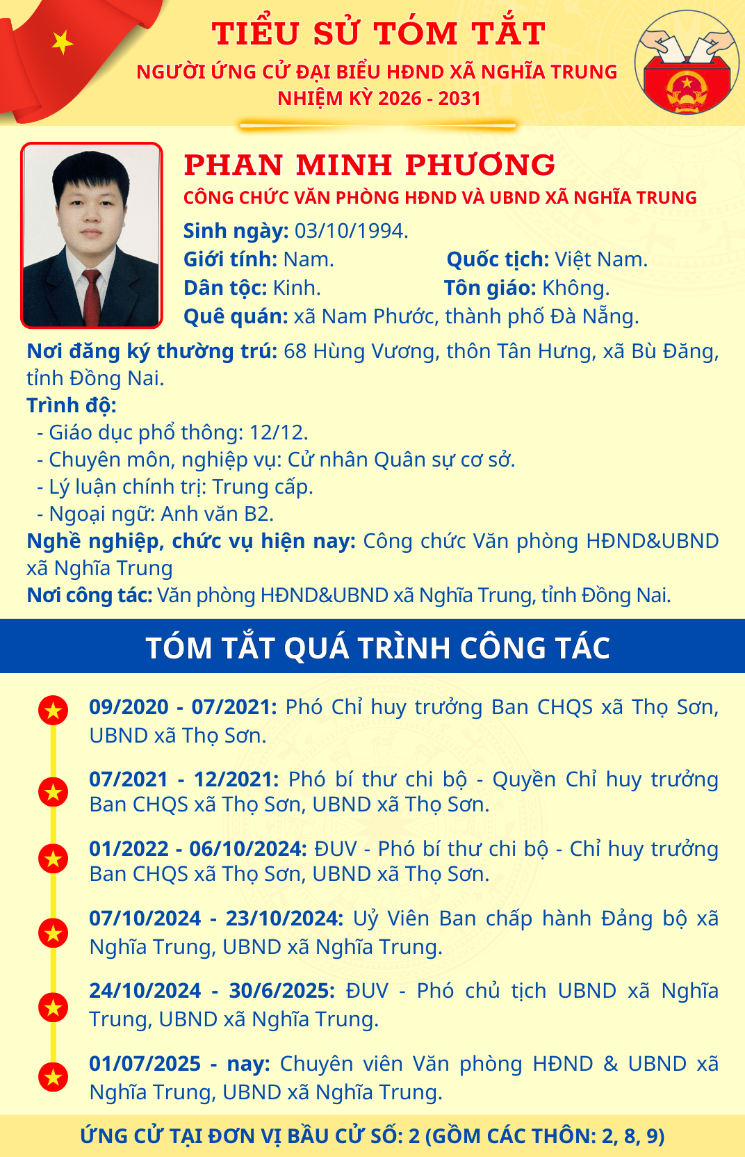 TÓM TẮT TIỂU SỬ NGƯỜI ỨNG CỬ ĐẠI BIỂU HĐND XÃ NGHĨA TRUNG NHIỆM KỲ 2026 - 2031 PHAN MINH PHƯƠNG