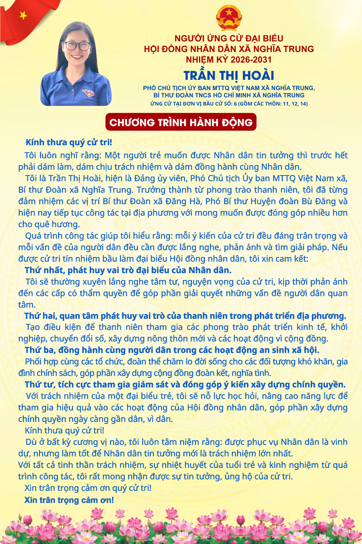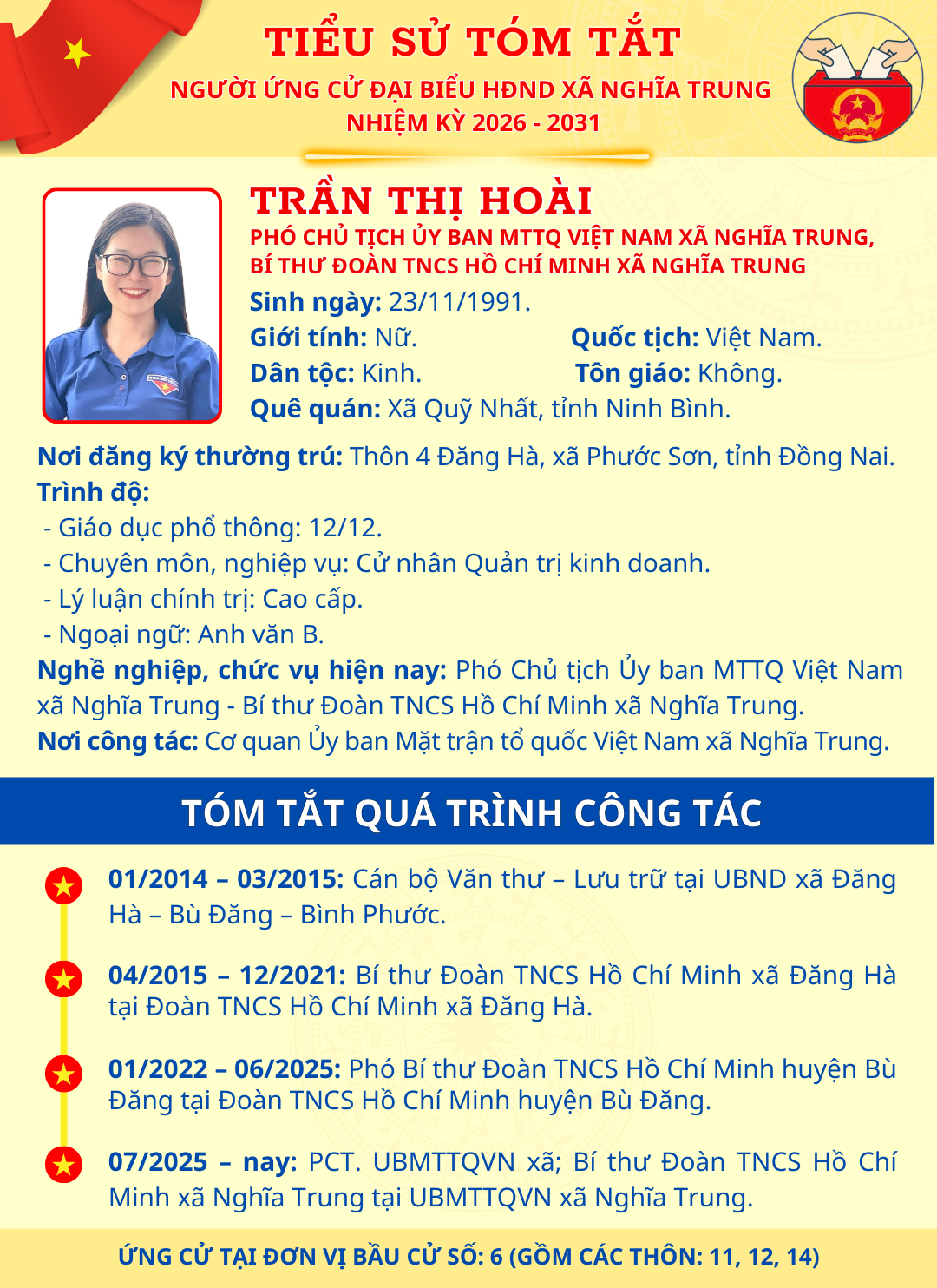 TÓM TẮT TIỂU SỬ NGƯỜI ỨNG CỬ ĐẠI BIỂU HĐND XÃ NGHĨA TRUNG NHIỆM KỲ 2026 - 2031 TRẦN THỊ HOÀI