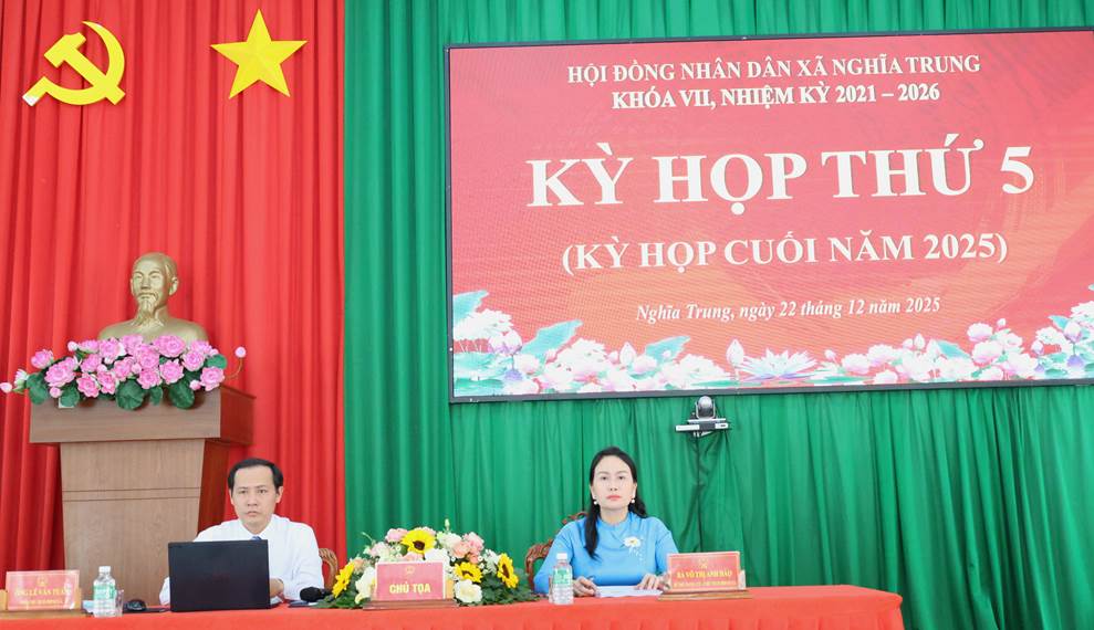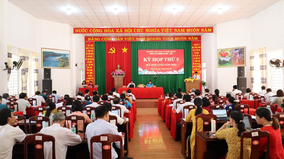 Chiều 22/12/2025, Hội đồng nhân dân xã Nghĩa Trung khóa VII, nhiệm kỳ 2021-2026 đã tổ chức Kỳ họp thứ 5 (Kỳ họp cuối năm 2025) nhằm đánh giá kết quả thực hiện nhiệm vụ phát triển kinh tế - xã hội, quốc phòng - an ninh năm 2025 và quyết định các nội dung quan trọng thuộc thẩm quyền của HĐND xã.