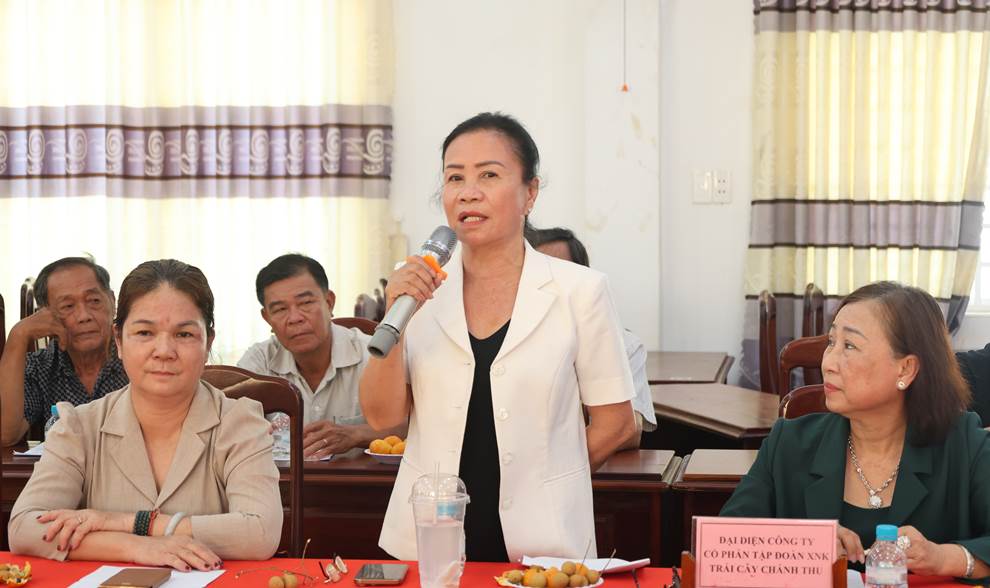 Phía Tập đoàn Chánh Thu đánh giá cao tiềm năng phát triển sầu riêng của xã Nghĩa Trung, đặc biệt là chất lượng trái và điều kiện thổ nhưỡng phù hợp. Đại diện Tập đoàn cũng chia sẻ kinh nghiệm trong việc xây dựng vùng nguyên liệu đạt chuẩn, quy trình xuất khẩu chính ngạch cũng như các yêu cầu về truy xuất nguồn gốc, mã số vùng trồng và tiêu chuẩn chất lượng quốc tế.