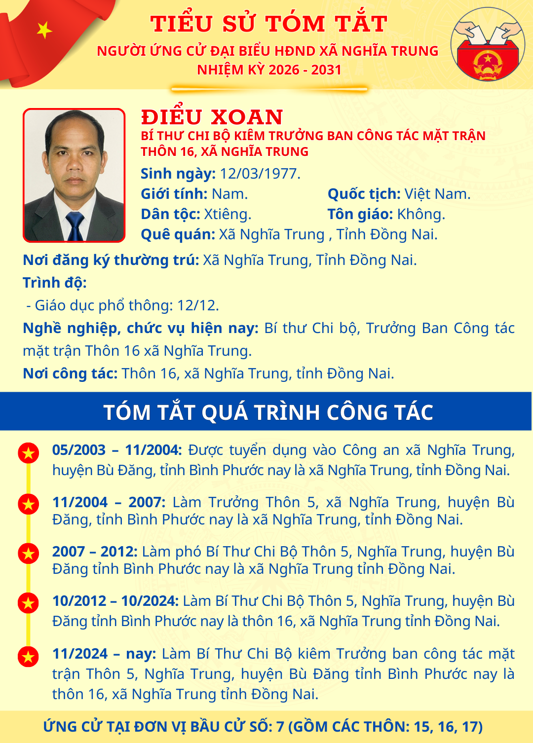 <h1>TÓM TẮT TIỂU SỬ NGƯỜI ỨNG CỬ ĐẠI BIỂU HĐND XÃ NGHĨA TRUNG NHIỆM KỲ 2026 - 2031 ĐIỂU XOAN</h1>