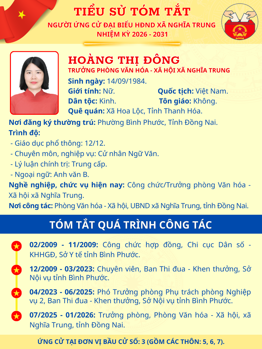 TÓM TẮT TIỂU SỬ NGƯỜI ỨNG CỬ ĐẠI BIỂU HĐND XÃ NGHĨA TRUNG NHIỆM KỲ 2026 - 2031 HOÀNG THỊ ĐÔNG