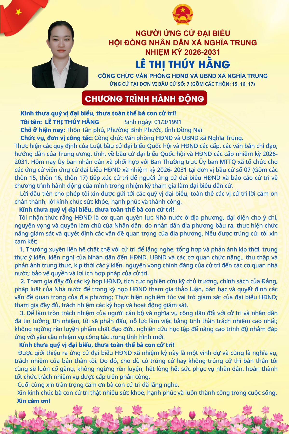TÓM TẮT TIỂU SỬ NGƯỜI ỨNG CỬ ĐẠI BIỂU HĐND XÃ NGHĨA TRUNG NHIỆM KỲ 2026 - 2031 LÊ THỊ THÚY HẰNG
