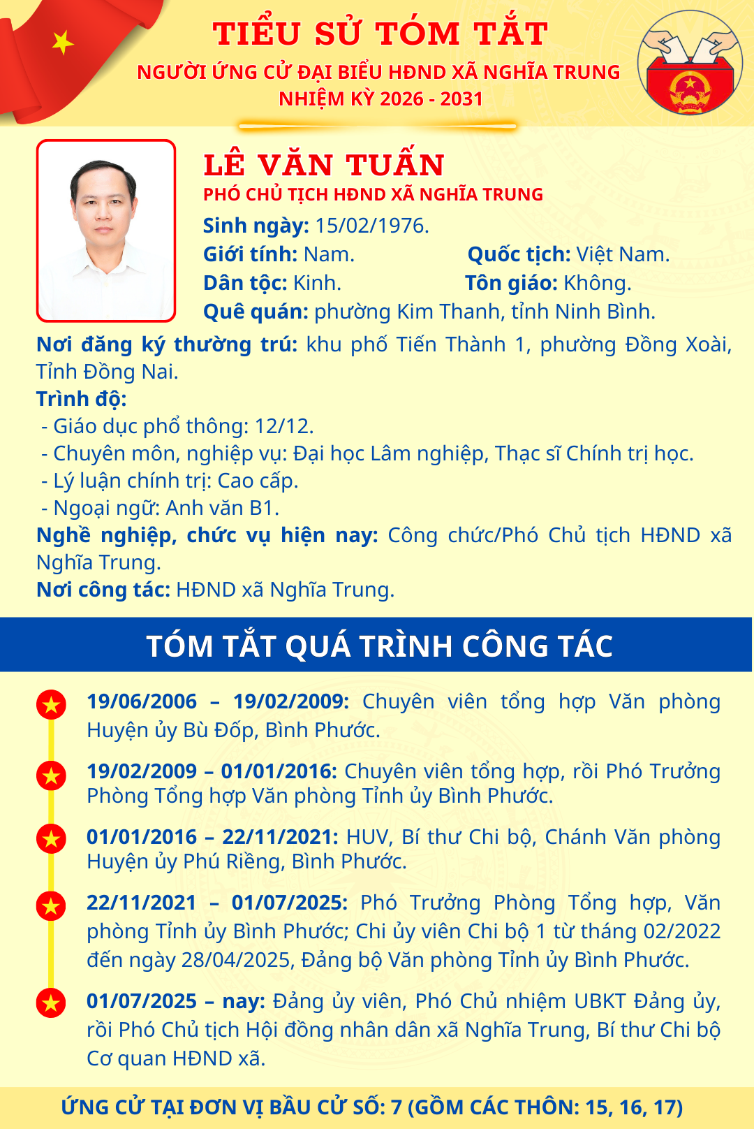 <h1>TÓM TẮT TIỂU SỬ NGƯỜI ỨNG CỬ ĐẠI BIỂU HĐND XÃ NGHĨA TRUNG NHIỆM KỲ 2026 - 2031 LÊ VĂN TUẤN</h1>