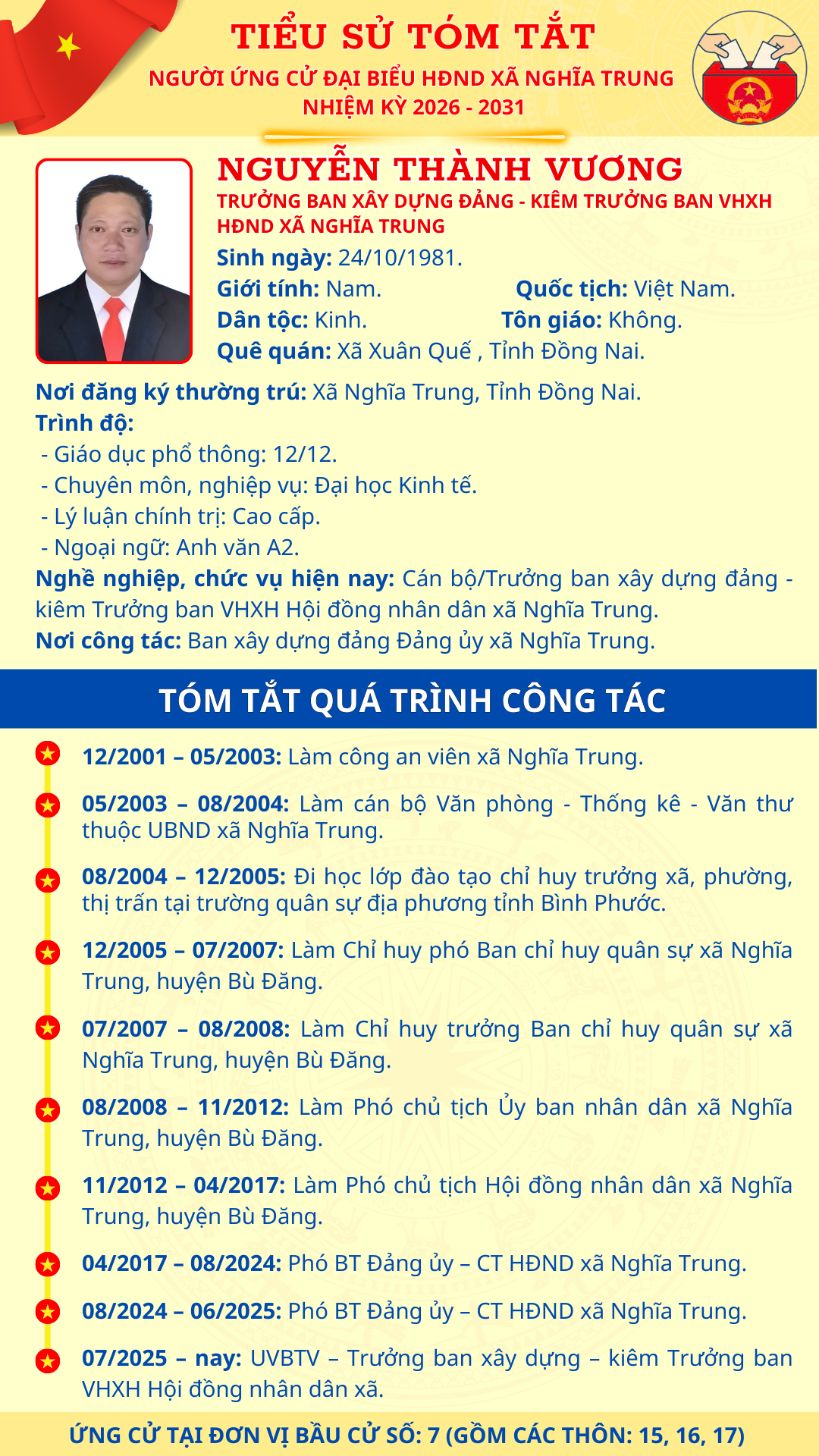 TÓM TẮT TIỂU SỬ NGƯỜI ỨNG CỬ ĐẠI BIỂU HĐND XÃ NGHĨA TRUNG NHIỆM KỲ 2026 - 2031 NGUYỄN THÀNH VƯƠNG