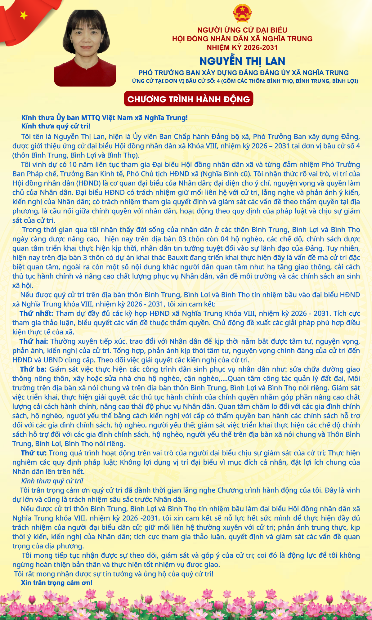 <h1>TÓM TẮT TIỂU SỬ NGƯỜI ỨNG CỬ ĐẠI BIỂU HĐND XÃ NGHĨA TRUNG NHIỆM KỲ 2026 - 2031 NGUYỄN THỊ LAN</h1>