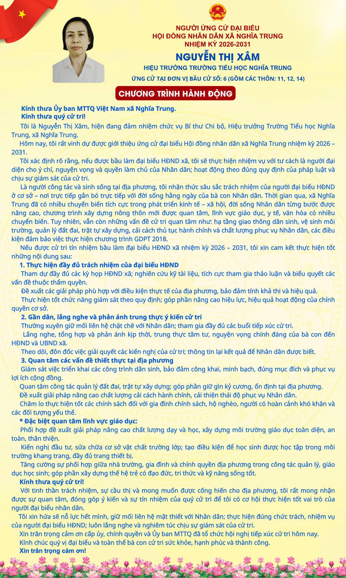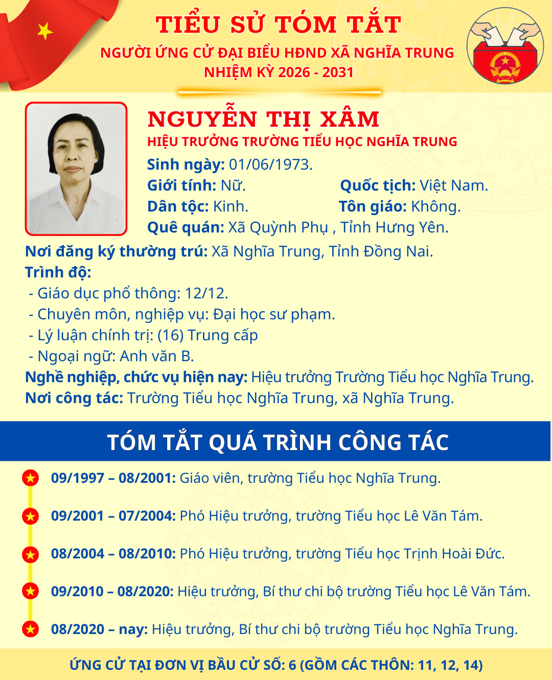 <h1>TÓM TẮT TIỂU SỬ NGƯỜI ỨNG CỬ ĐẠI BIỂU HĐND XÃ NGHĨA TRUNG NHIỆM KỲ 2026 - 2031 NGUYỄN THỊ XÂM</h1>