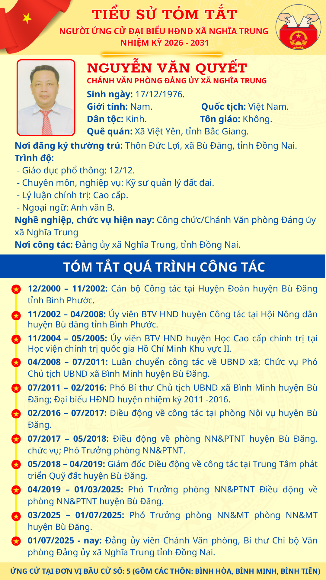 TÓM TẮT TIỂU SỬ NGƯỜI ỨNG CỬ ĐẠI BIỂU HĐND XÃ NGHĨA TRUNG NHIỆM KỲ 2026 - 2031 NGUYỄN VĂN QUYẾT