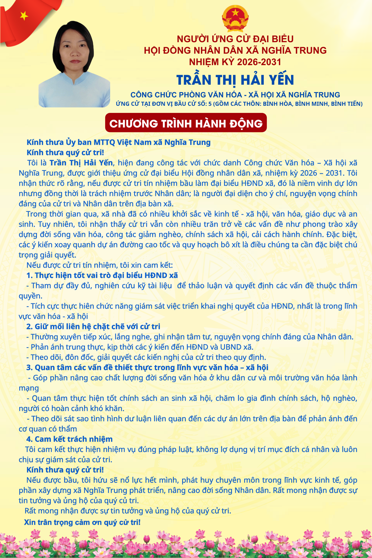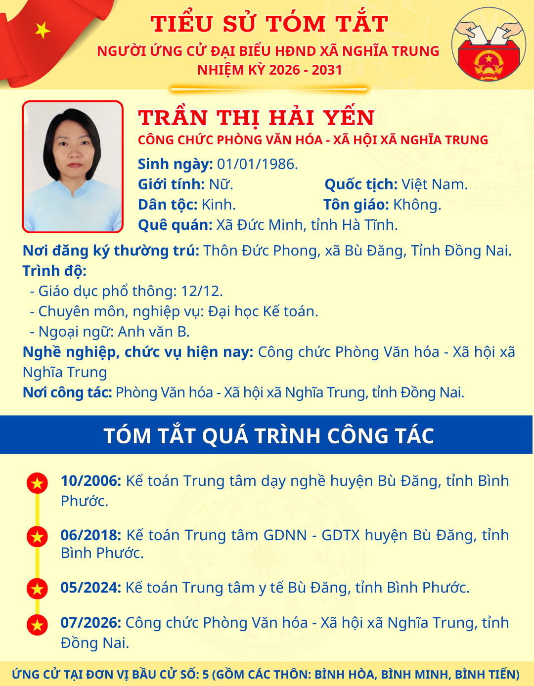 <h1>TÓM TẮT TIỂU SỬ NGƯỜI ỨNG CỬ ĐẠI BIỂU HĐND XÃ NGHĨA TRUNG NHIỆM KỲ 2026 - 2031 TRẦN THỊ HẢI YẾN</h1>