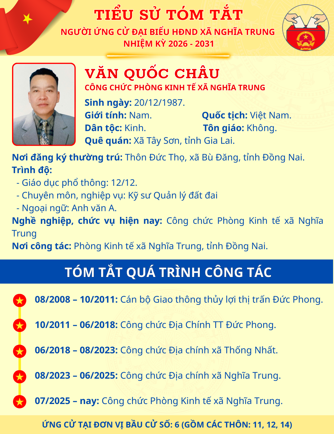 <h1>TÓM TẮT TIỂU SỬ NGƯỜI ỨNG CỬ ĐẠI BIỂU HĐND XÃ NGHĨA TRUNG NHIỆM KỲ 2026 - 2031 VĂN QUỐC CHÂU</h1>