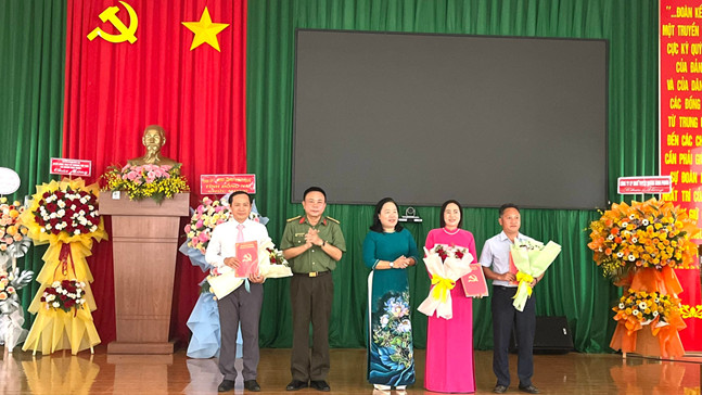 Đ/c Nguyễn Thụy Phương Thảo - GĐ Sở Tài chính thừa ủy quyền của Tỉnh ủy cùng Phó GĐ Công an tỉnh Nguyễn Phương Đằng tặng hoa chúc mừng.